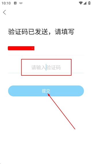 在验证码填写页面,输入收到的验证码,点击提交按钮即可完成账号注册。
