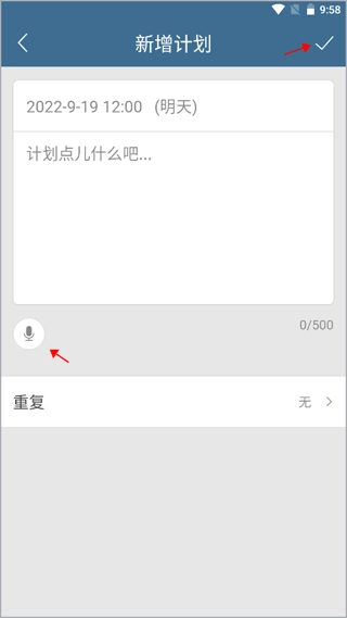 可以通过手动输入或者语音输入的方式来记录未来的计划,你可以根据自己的实际需求决定是否重复该计划,完成后点击右上角的“√”,就能成功新增计划了。
