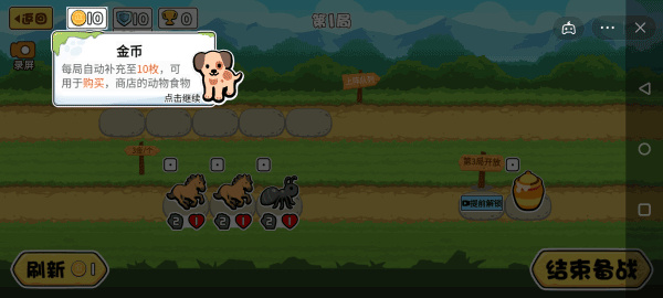 1、首先动物之战自走棋游戏中每局的金币会自动的补充10枚,可以购买商店的动物食物。