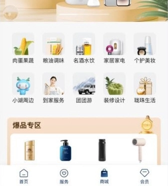 在商城里,你可以找到时令生鲜、米面粮油这类日常所需的食品,还有数码家电、家装保洁服务,以及邻里出游等生活相关的项目。