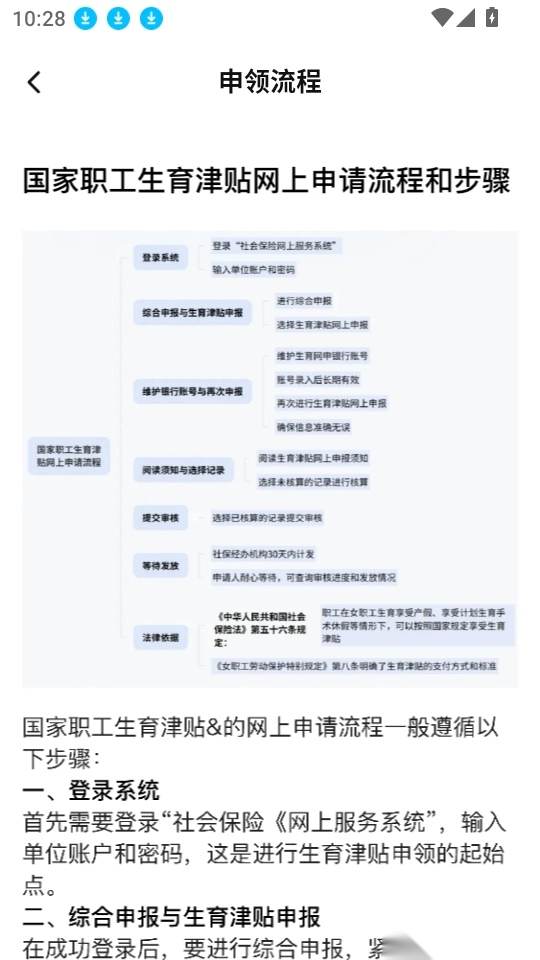 之后就能查询生育补贴的申请流程,了解具体的步骤了。