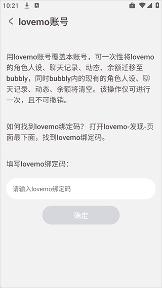 3. 使用Lovemo账号覆盖当前账号,能够把角色人设、聊天记录、动态、余额转移至Bubbly,并且会清除Bubbly现有的数据。此操作一旦执行便无法撤销。