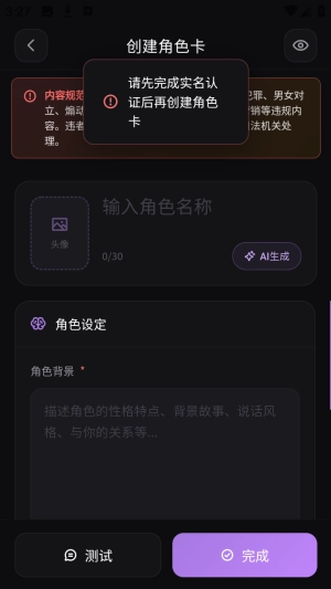 3、输入角色名称、设定等信息,点击 “完成” 即可。