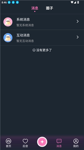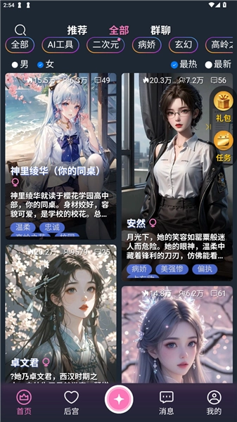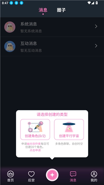从渠道完成应用并启动后,首页支持横向滑动浏览不同ai角色,进入“后宫”模块可自定义创建特色角色,通过“行星”功能进行角色类型设定,消息中心整合各类通知与互动记录,个人中心展示完整功能矩阵。