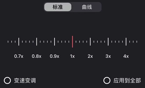 标准变速能借助滑块调节播放速度(慢动作推荐设置0.8倍速),曲线变速允许在特定时间点添加变速节点。调整过程中可同步开启【变速变调】功能,点击【应用到全部】即可进行批量处理。