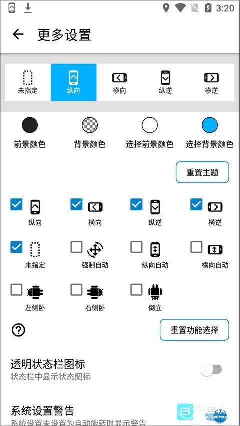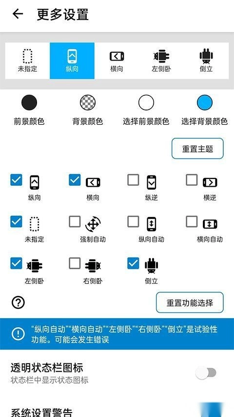 您可以随时调整屏幕方向(有四个方向可选)、设置传感器显示位置、强制锁定屏幕方向、更改状态栏图标、一键重置应用程序主题并找到其他喜欢的主题使用。