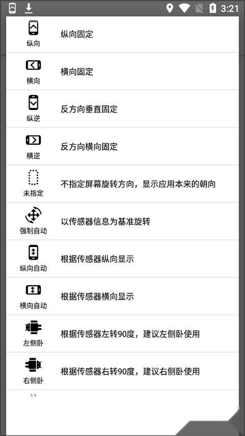 反向竖屏为真正锁定屏幕为反向竖屏方向,反向横屏为真正锁定屏幕为反向横屏方向,自动横屏为自动在横屏和反向横屏之间选择,手动为普通手动模式且不会覆盖应用程序设置,锁定为真正将屏幕锁定为当前方向,自动竖屏为自动在竖屏和反向竖屏之间选择。