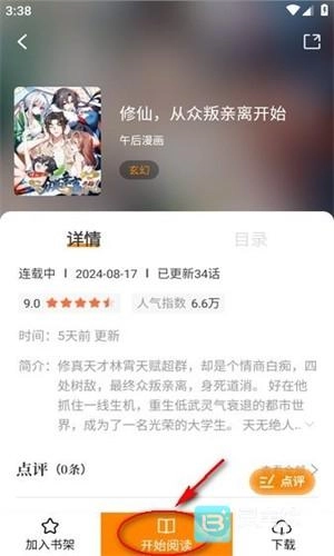 请前往本站最新版本的漫画应用“漫天玉”(打开后界面显示为“漫天星”,功能与内容完全一致),安装并打开App后选择想看的漫画,点击下方【开始阅读】按钮进入阅读页面,阅读界面右下角会显示类似“3/37”的页码标识(“3”为当前页,“37”为本章节总页数),若希望离线观看,可点击【开始阅读】旁边的按钮,根据提示选择缓存画质或章节范围。