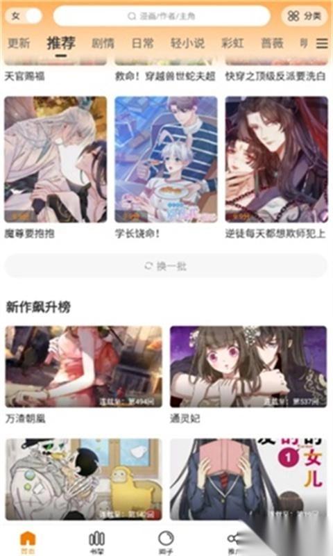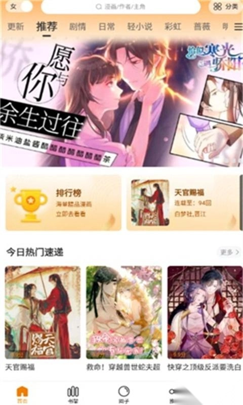 1、漫天星漫画为用户提供免费的漫画阅读服务,平台上的漫画类型丰富多样,包含全彩高清、热血日韩、唯美可爱等不同风格,资源储备十分充足。