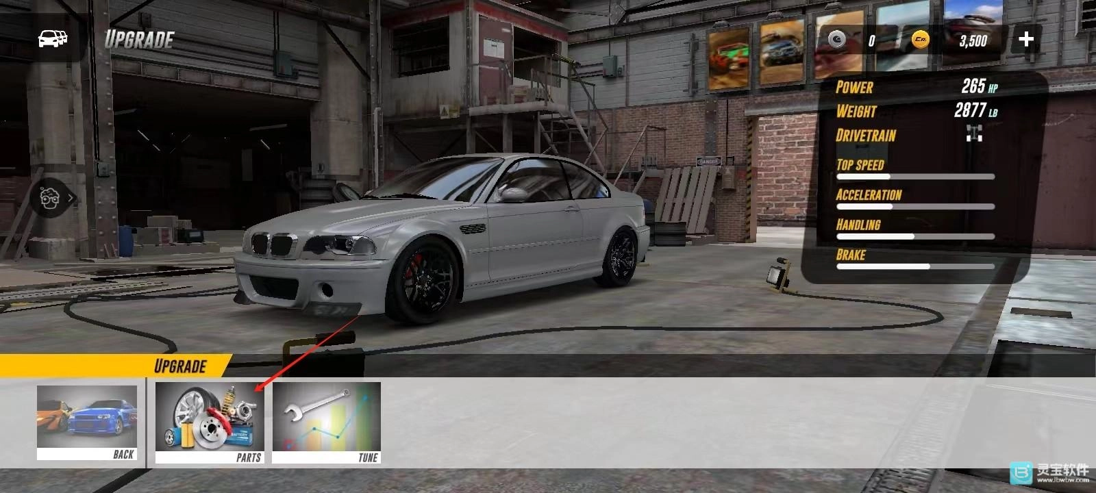 10、最后一个任务是给汽车安装升级版,操作步骤是先点击车库,接着点击【UPGRADE】,再点击【PARTS】,就能在这个界面购买需要升级的零件了。