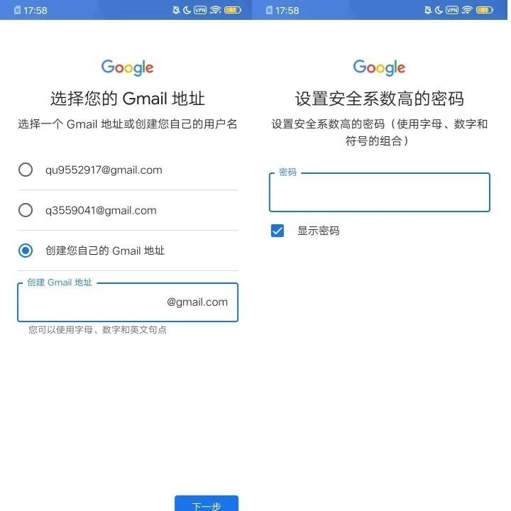 选择一个或创建一个账户。谷歌会随机给你生成两个账户,你可以选择谷歌给的,也可以自己创建一个地址。