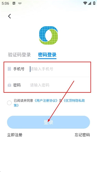 在密码登录页面,输入手机号与密码,勾选相关协议后,点击登录按钮。
