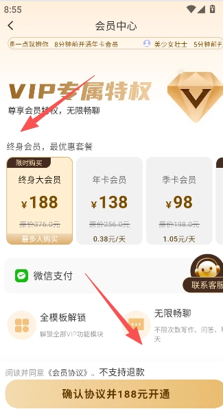 支付188元费用后,点击下方的确认协议选项,即可完成开通操作。