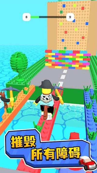 踏入跑道,控制角色避开障碍,拾取积木,奔向终点。