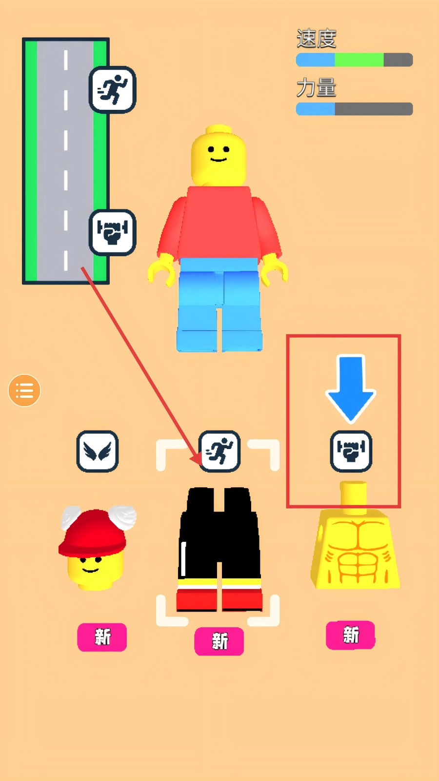根据角色的属性特征,点击相应的积木块并将其放置到左侧的方框内,从而组合成新的角色。