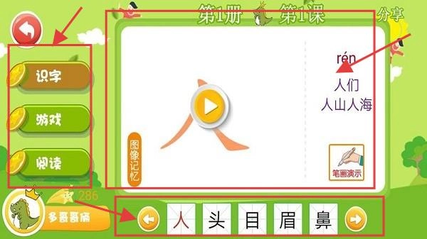 在课程页面,你可以点击【识字】【游戏】【朗读】这些功能按钮来开展学习;借助【图像记忆】【笔画演示】这两个功能,能够帮助你更好地理解和记忆汉字。