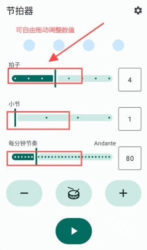 节拍设置:可自定义每小节的拍数(拍子)以及循环的小节数量。