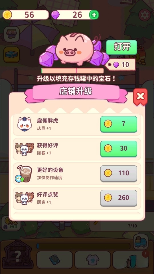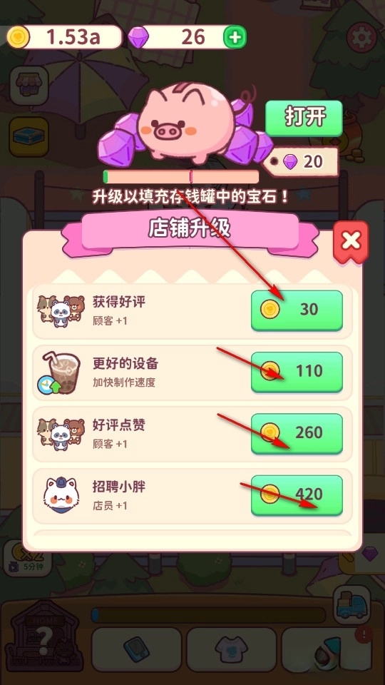店铺升级次数增多后,我们的收入自然会随之增长,所以赚钱速度的快慢就和店铺升级的进度直接挂钩了。想要给门店升级的话,点击右下角就能完成相关操作。