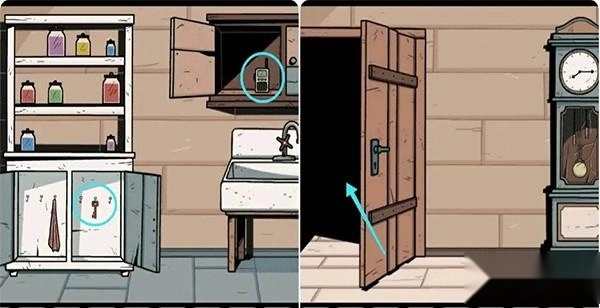2、推开蓝色的门进入盥洗室,依据照片上的提示来摆放架子上的罐子,完成这一步后取走下方的钥匙,随后打开水池上方的柜子获取对讲机,再出去用钥匙打开钟表左侧的门。