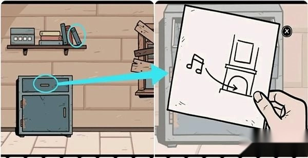 3、进入楼梯间拿走架子上的蓝色笔记本,再打开保险箱上层的抽屉观察里面的纸条,纸条上提示我们对烟囱播放音乐。
