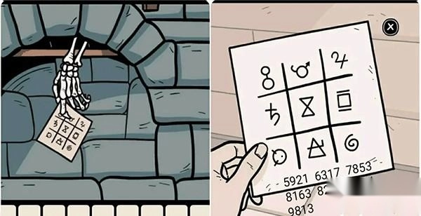 5、走到壁炉旁,掀开画框上的白布,触发剧情。随后用对讲机对壁炉使用,会收到一张纸条。仔细观察纸条上的符号,再结合收音机的频道数字,就能得到四个符号组成的密码。