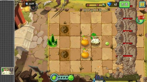这个关卡的难点在于铜人会在10秒后复活,要是没及时把他消灭,植物很容易被他踩死。开局时在第五排附近放白萝卜,用来抵挡气功僵尸吸走植物,第四排则可以摆上火葫芦,等小僵尸靠近时,就能喷火把它们消灭掉。