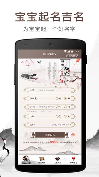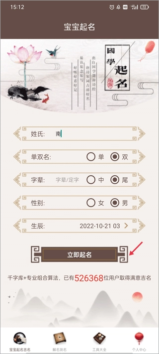 打开并进入【宝宝起名吉名】的主页面,在姓氏输入框中填写姓氏,选择要取单字名还是双字名,接着选定孩子的字辈、性别、生辰等相关信息,之后点击页面下方的“立即起名”按钮。
