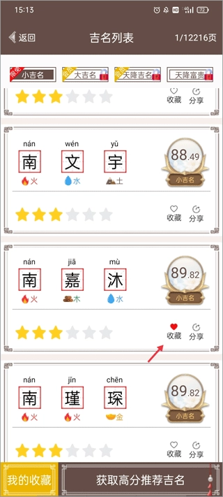 此时页面会呈现出一连串的吉名清单,从中挑选出自己心仪的名字即可。