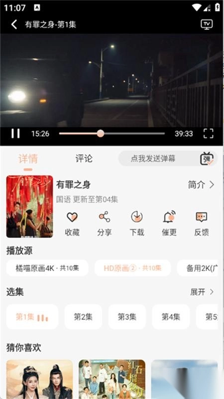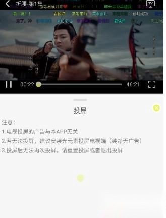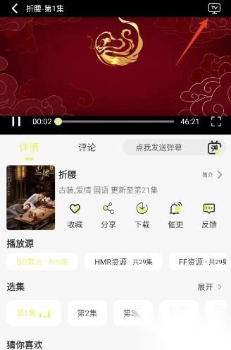 安装橘猫4K并打开应用,选择《折腰》等任意剧集播放,点击播放界面右上角的“TV”图标,确保手机与设备连接同一网络即可完成投屏操作。