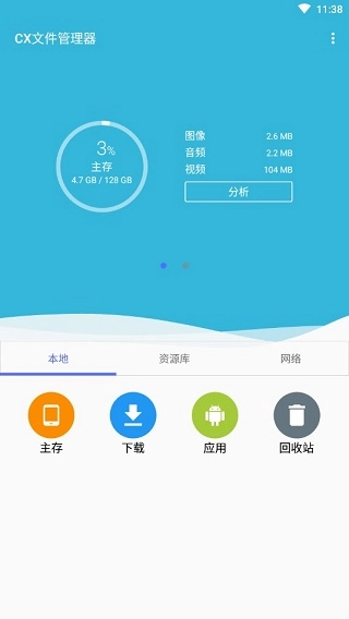 Cx File Explorer可整理移动设备内部和外部存储的文件和文件夹,管理云存储、NAS上的文件,管理移动设备上安装的应用程序,提供可视化存储分析和回收站功能以管理存储。