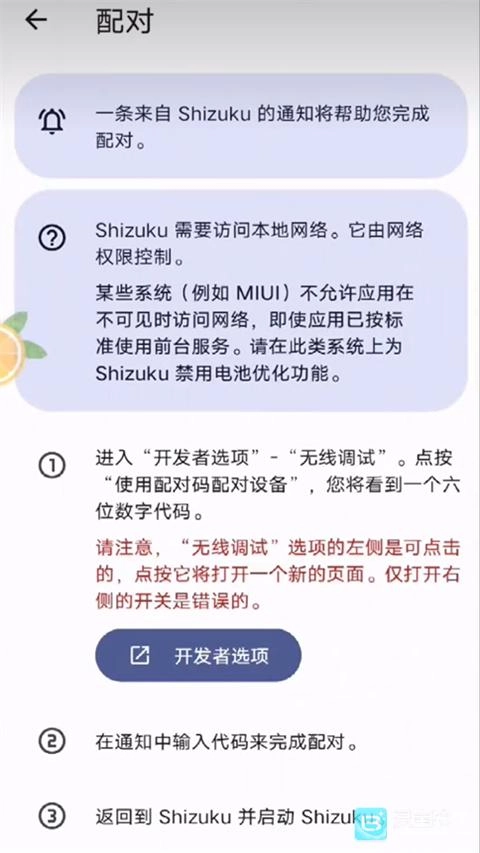 前往设置通过连续点击设备版本选项中的软件版本号激活开发者模式,打开Shizuku点击配对,点击开发者选项,打开开发者模式,将USB、无线调试打开。