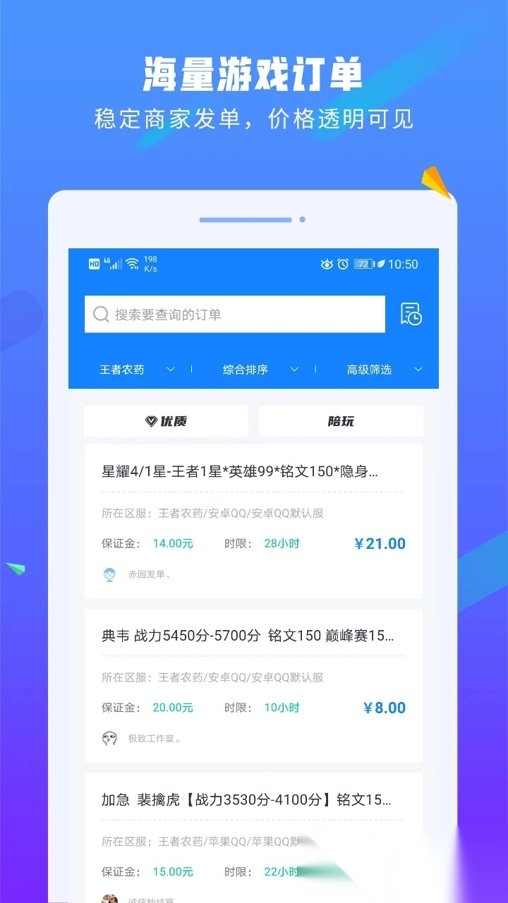 拥有大量游戏订单,种类齐全,均由稳定商家发布,价格公开透明。
