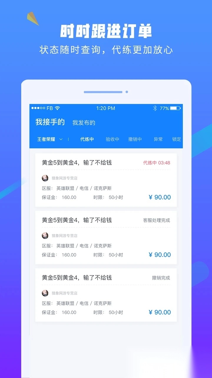 支持在线查询订单实时状态,随时掌握代练进度,让你更加安心,并能快捷了解订单详情。