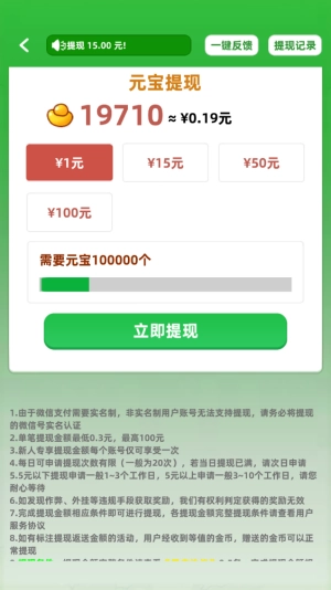 新手玩家通过第一关就能获得一个不小的红包奖励,我第一次玩就拿到了30000金币,换算下来正好可以直接提现0.3元,而且是实时到账的。另外元宝也能用来兑换红包提现,不过需要积累到1元才能操作,总体而言体验还是相当不错的。