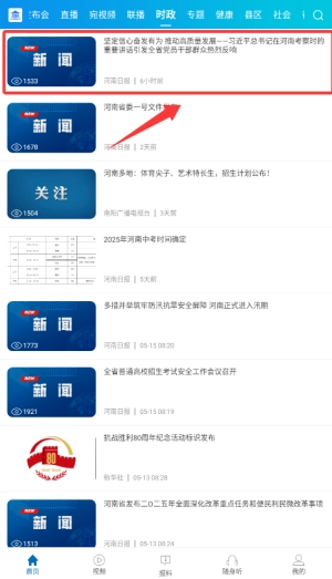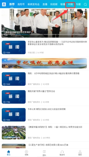 启动云上南阳后,在首页顶部的导航栏里找到蓝色的“时政”标识,点击该标识就能进入政务新闻专区。
