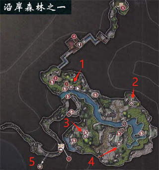 绕着地图边缘转一圈可以找到8个猎鬼者,还剩两个猎鬼者在上半张图的桥边,尤其注意第一个猎鬼者需要从营地往回走一小段,如图: