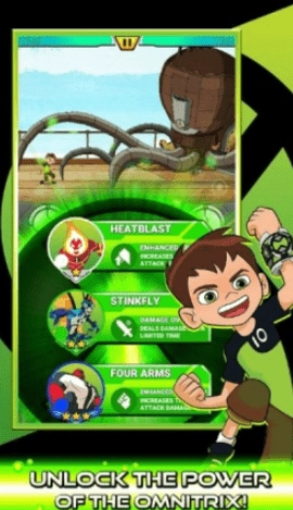 你可以化身成剧中你最喜爱的外星英雄,像四手霸王、火焰人、钻石战神这类角色都可以选择,而且每个英雄都具备独特的绝技,能让战斗的形式变得更加丰富多样!