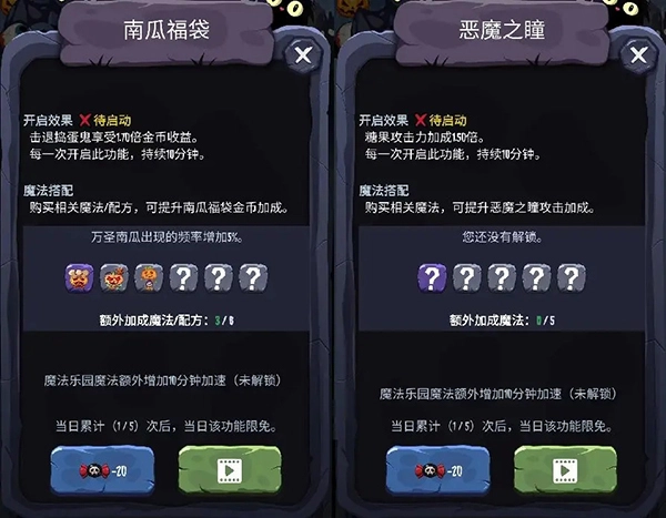 2、借助魔法乐园能够解锁“南瓜福袋”和“恶魔之瞳”这两项功能,开启这些功能需要使用魔法糖果。