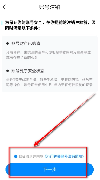页面会呈现《八门神器账号注销须知》,阅读完毕后勾选“我已阅读并同意”选项,接着点击“下一步”按钮。