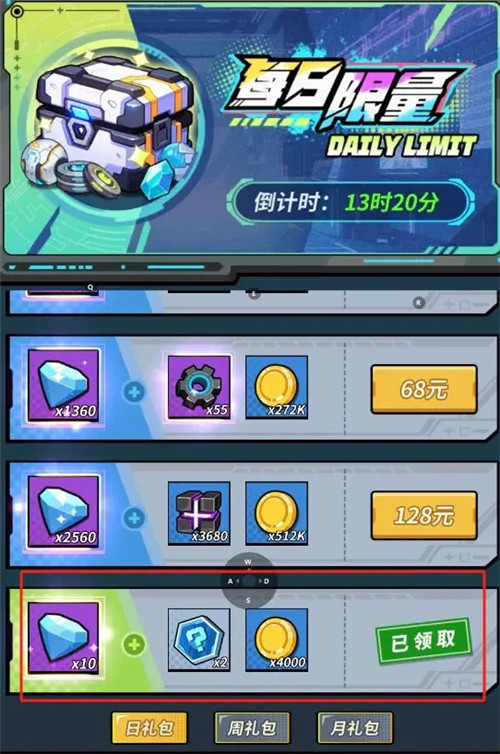 每日特惠分为日礼包、周礼包、月礼包,每种礼包都有一个免费的礼包,礼包的冷却时间都不一样。