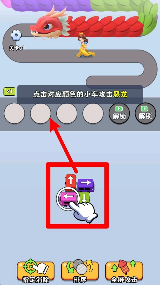 点击颜色相同的小车发起攻击,凭借精准的操作助力公主击退前方恶龙的威胁,清除通路障碍以实现快速推进。