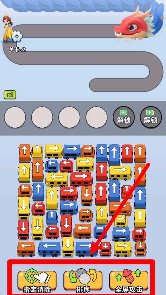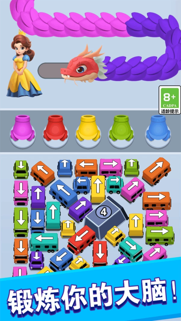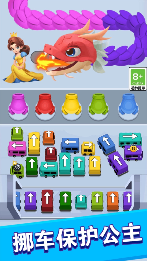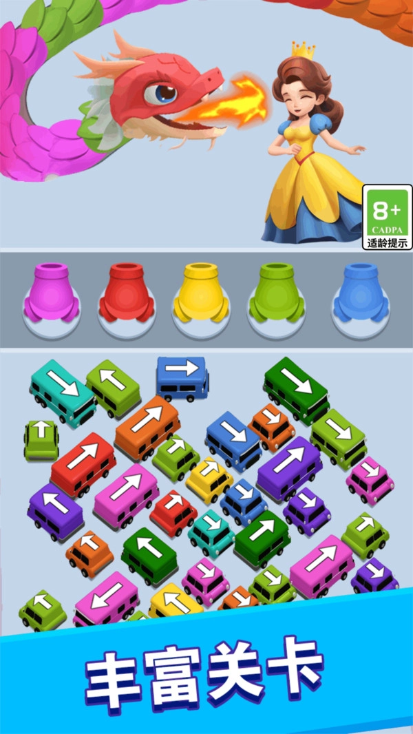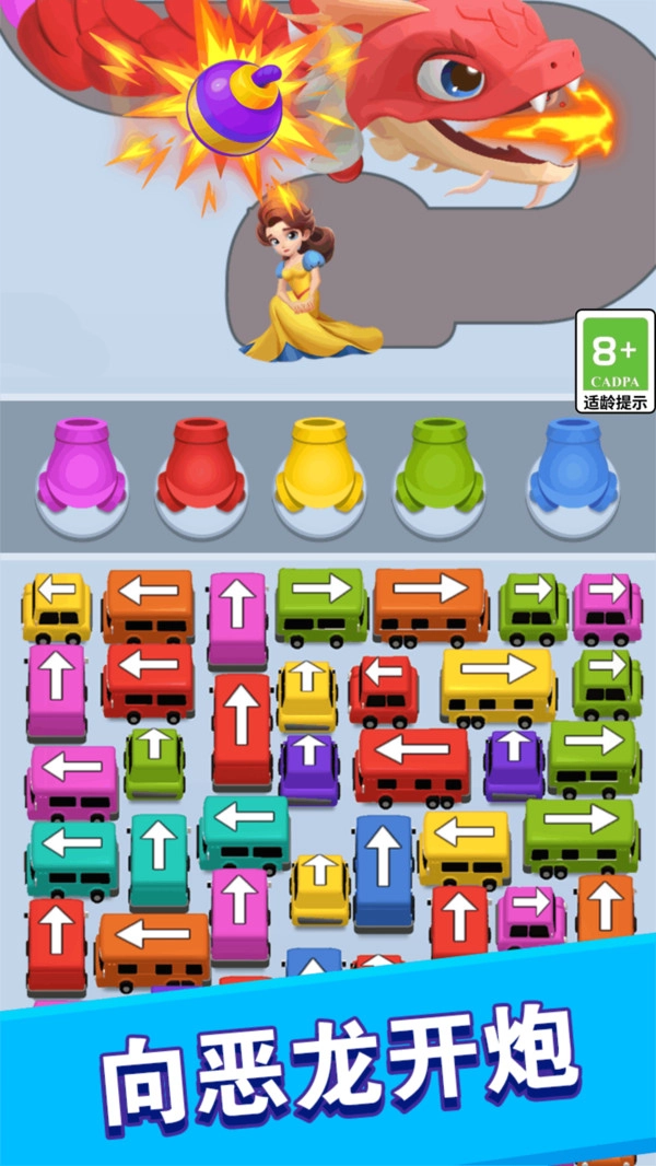 核心消除规则:点击三个颜色和朝向均相同的小车就能达成消除,助力公主清除路障,顺利抵达终点。