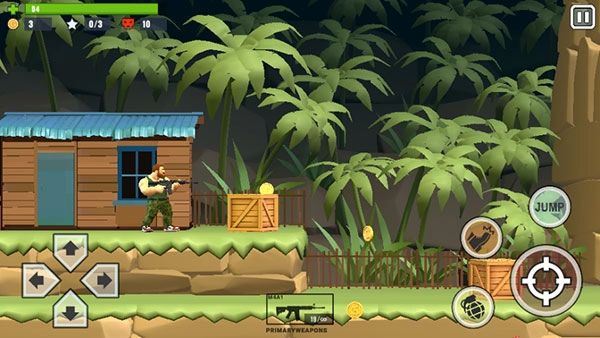 用左侧轮盘操控角色移动,右侧按钮依次对应跳跃、踢打、投掷手雷与射击功能。