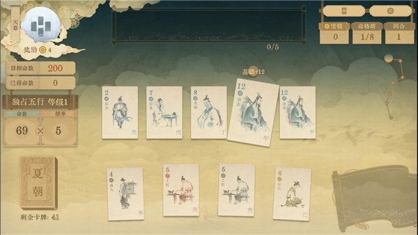3、天幕作为对手,随机施加负面效果,玩家需用卡牌组合突破目标命数,实现逆天改命。