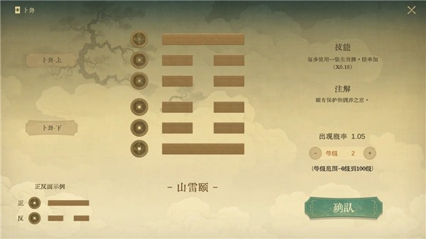 1.首先需要抽取卦象,卦象是决定我们这局游戏运营的关键,其中有牌型加强、增加宝钱收入等等强化。