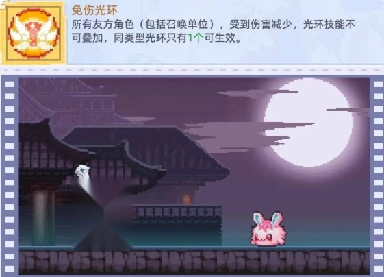 免伤光环:激活后,所有友方单位以及召唤物都会获得减伤增益效果,且该光环效果无法叠加(具体效果请以游戏内实际表现为准)