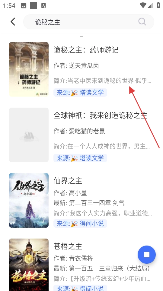 在书架上点击想要找的书,比如《诡秘之主》,就能进入对应的搜索结果页面。