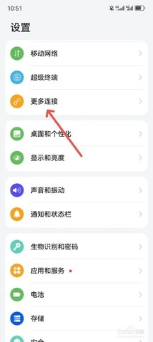 打开华为手机设置页面,点击更多连接选项