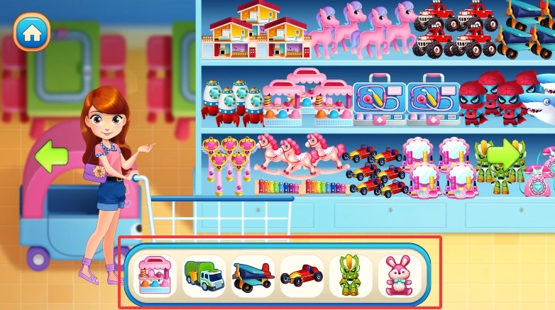 根据顾客的具体需求,从下方挑选对应的玩具商品,并在货架上准确找到后放入购物车。