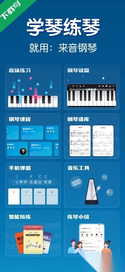 这是一款功能全面的学习软件,它整合了乐理知识讲解、五线谱识谱训练、节拍器、和弦弹唱等实用功能,还提供租琴、调音等贴心服务,为用户带来丰富的学习资源。